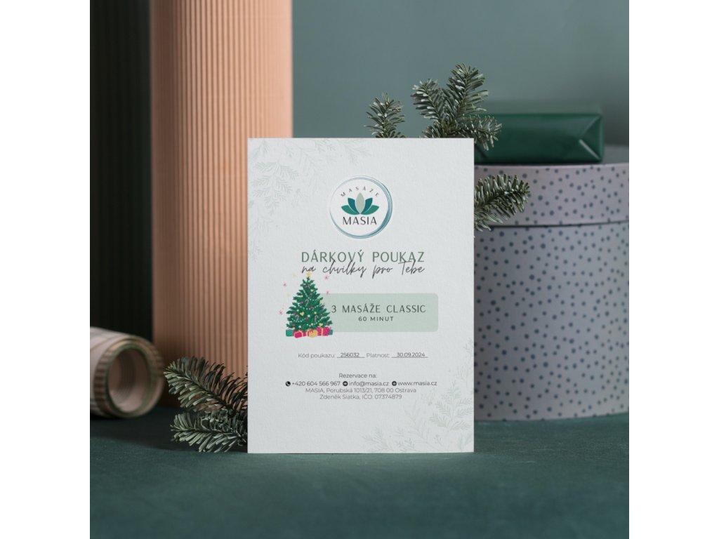 Vánoční voucher na permanentku na 3 či 5 masáží Classic v délce 60 minut.